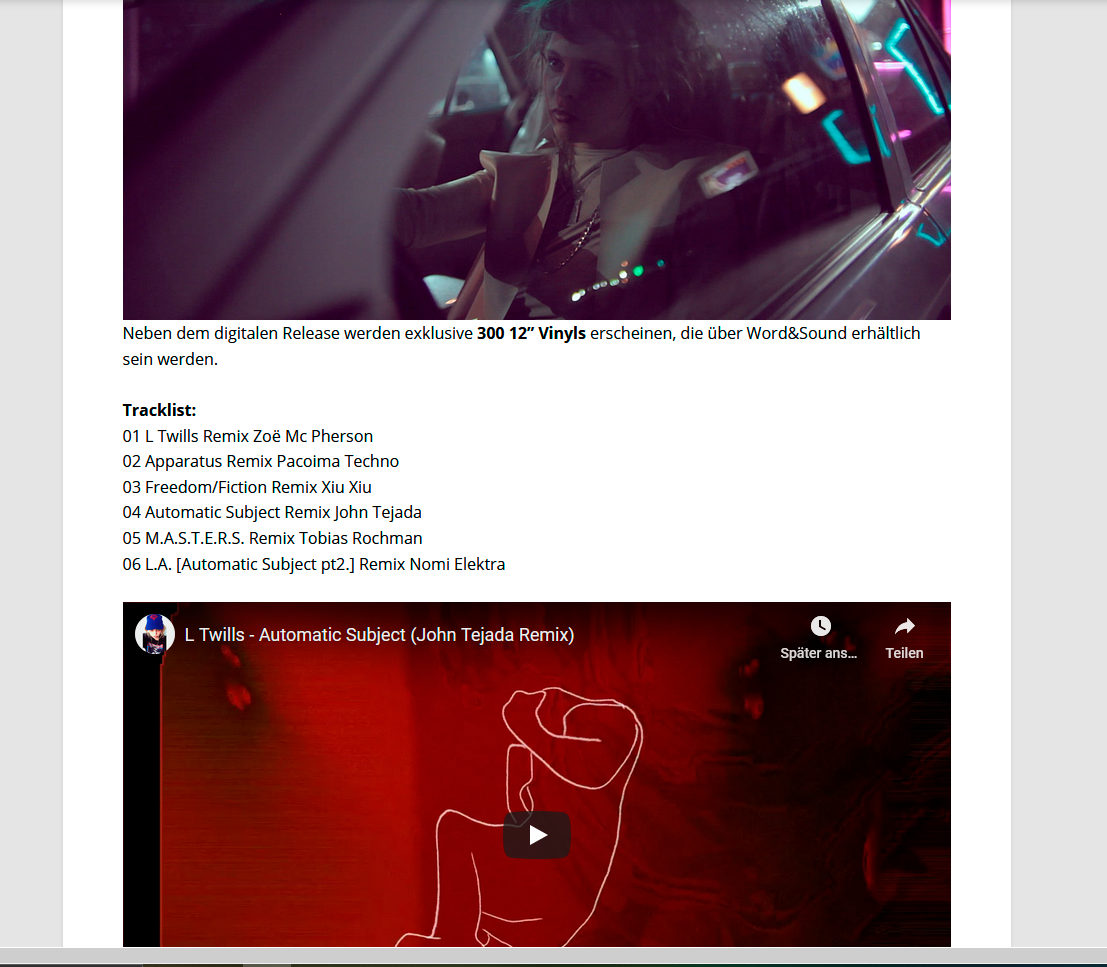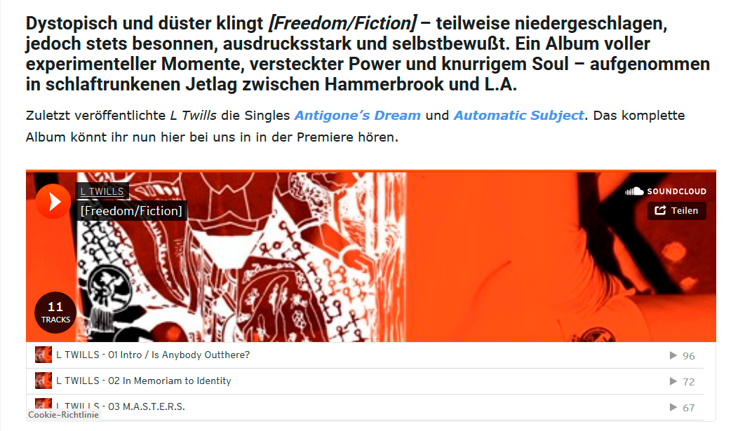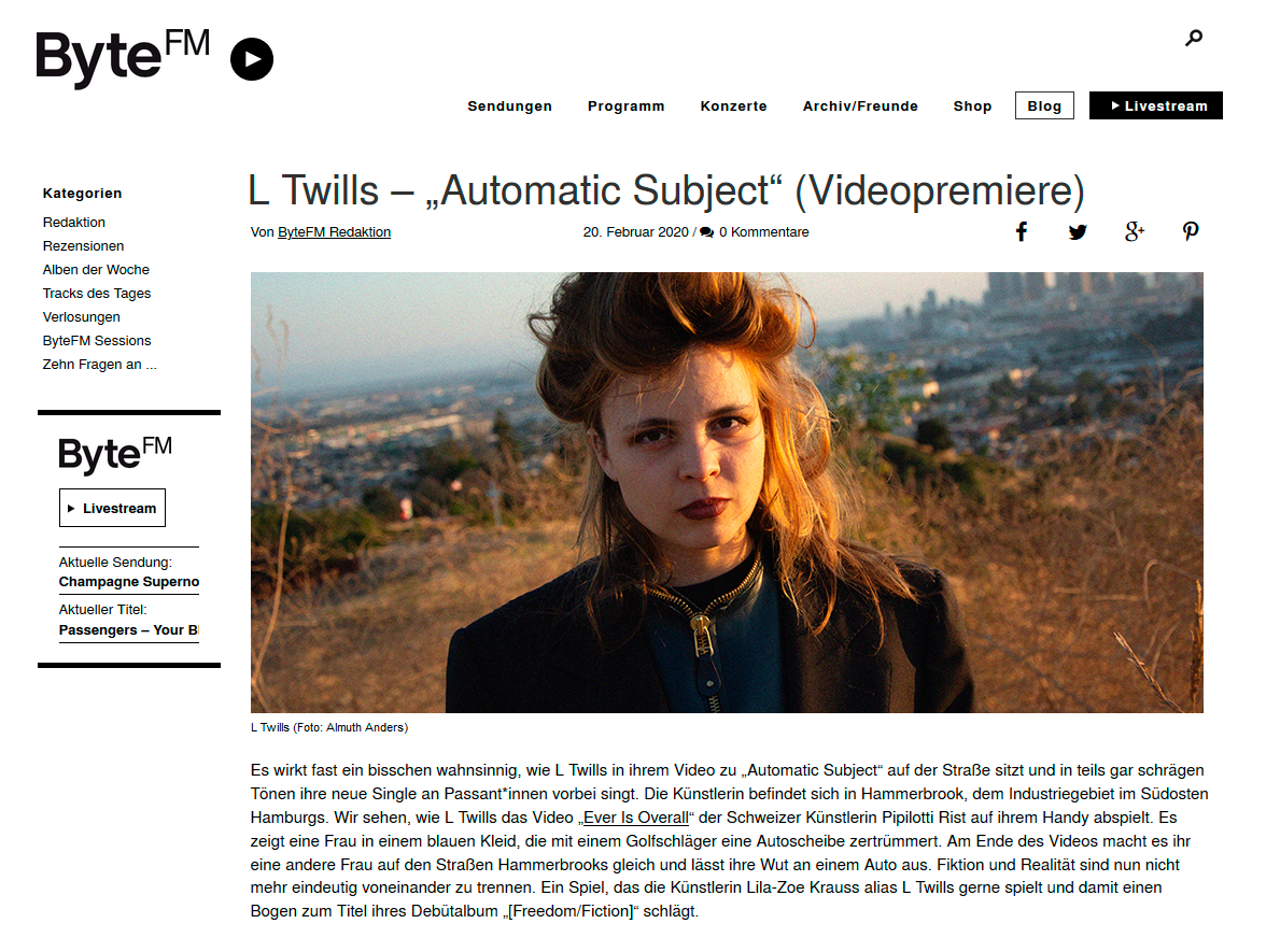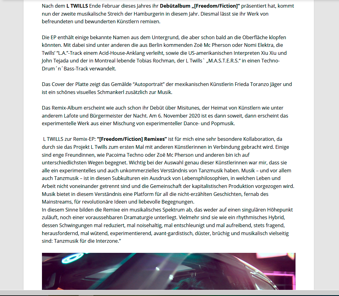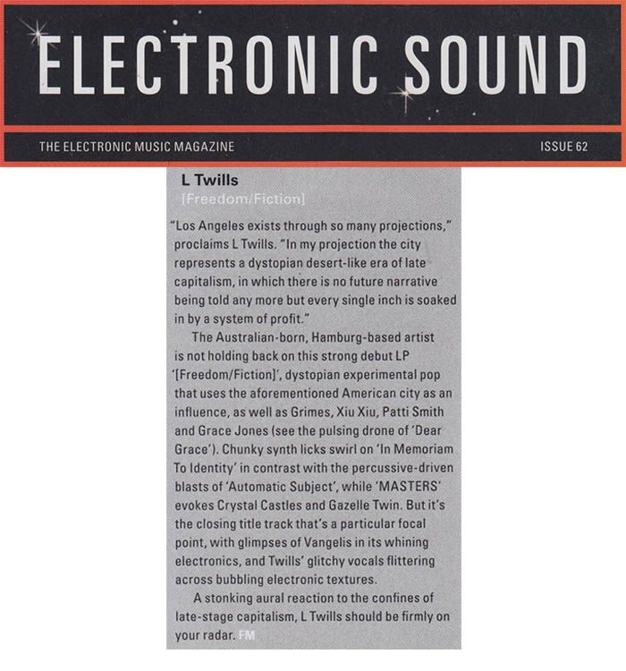 Starting to perform in Hamburg‘s underground venues like the Golden Pudel Club in 2017, it is the same year she self-released the 7inch Single Young Boys/Too Late for the End, pressed by local vinyl pressing plant Ramona Records. First international attention L Twills with the release of her 12inch debut album [Freedom/Fiction] in 2020, which she produced in Los Angeles. Calinfornian online magazine XLR8R, British print magazine Electronic Sound and Austrian weekly Der Falter featured the album. It garnered positive radio play from Byte Fm, BBC, RBB and Dublab LA. Shortly after the [Freedom/Fiction] REMIX compilation appeared, featuring artists like Zoë Mc Pherson, John Tejada, Xiu Xiu and Tobias Rochmann).